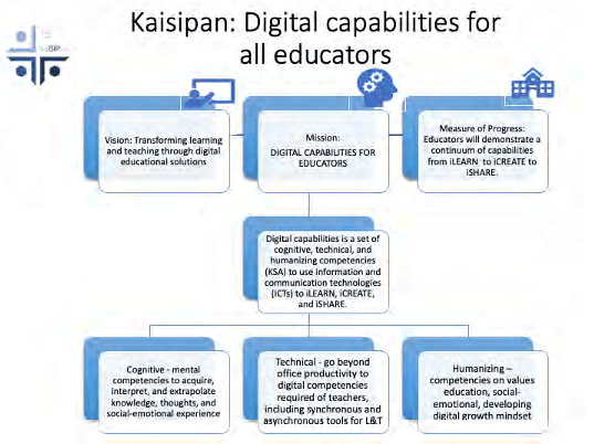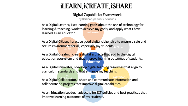 The iLEARN, iCREATE, iSHARE: a digital capabilities framework for Philippine educators provides the scaffolding for Kaisipan’s learning and teaching (L&T) approach. Our mission is digital capabilities for all educators. We define digital capabilities as a set of cognitive, technical, and humanizing competencies to use information and communication technologies (ICTs) to iLEARN, iCREATE, iSHARE.