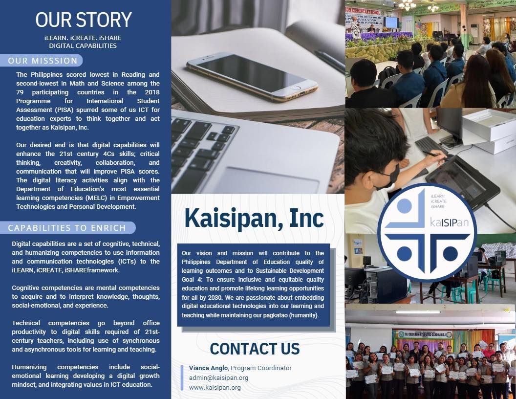 KaISIPan, Inc. is a 501(c)3, not-for-profit corporation registered in Florida, US. KaISIPan is a giving back NGO for education composed of partner individuals and institutions whose shared vision is transforming learning and teaching through digital educational technology. Our mission is digital capabilities for all Filipino educators. Our vision and our mission will contribute to DepEd's Sulong Edukalidad's